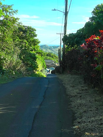 パウオアの入り口辺りは平坦ですが、山に向かう道はかなり傾斜があり、私有地になる手前まで登ると、標高164メートルのパンチボールが眼下に見えます。
