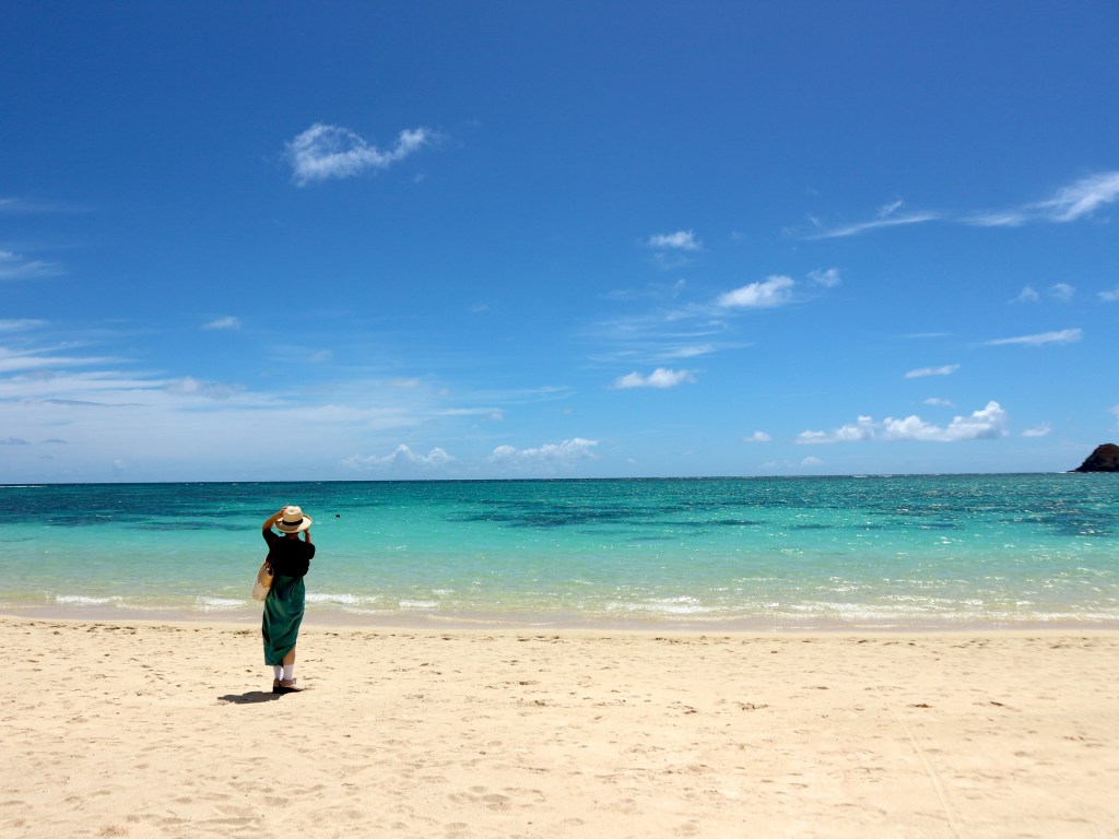 せっかくカイルアまで来たので、ランチだけではもったいないということで、まずはカイルアビーチに立ち寄りました。平日なので、駐車場も空いていました。ちょうどティーンエージャーらしきグループが車から降りてきたのですが、みんなマスクをしていて、ハワイの人って礼儀正しいなぁとつくづく思いました。