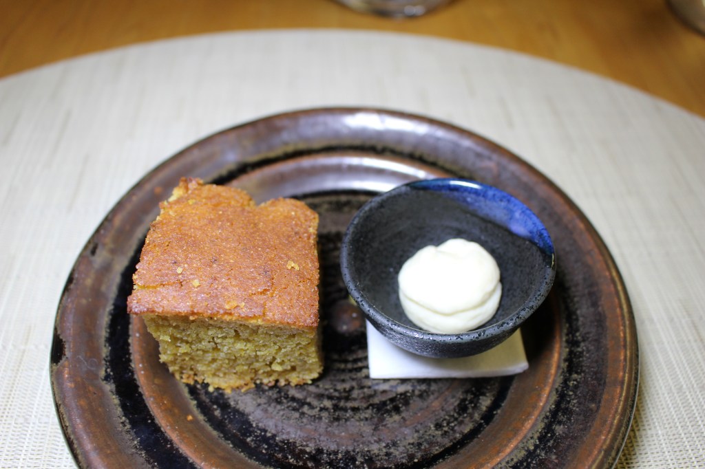 まずは、白味噌ハニーバターを添えたバターミルクのコーンブレッドがでてきました。コーンブレッドは適度に温められています。こういうちょっとした心遣いが嬉しいですよね。
