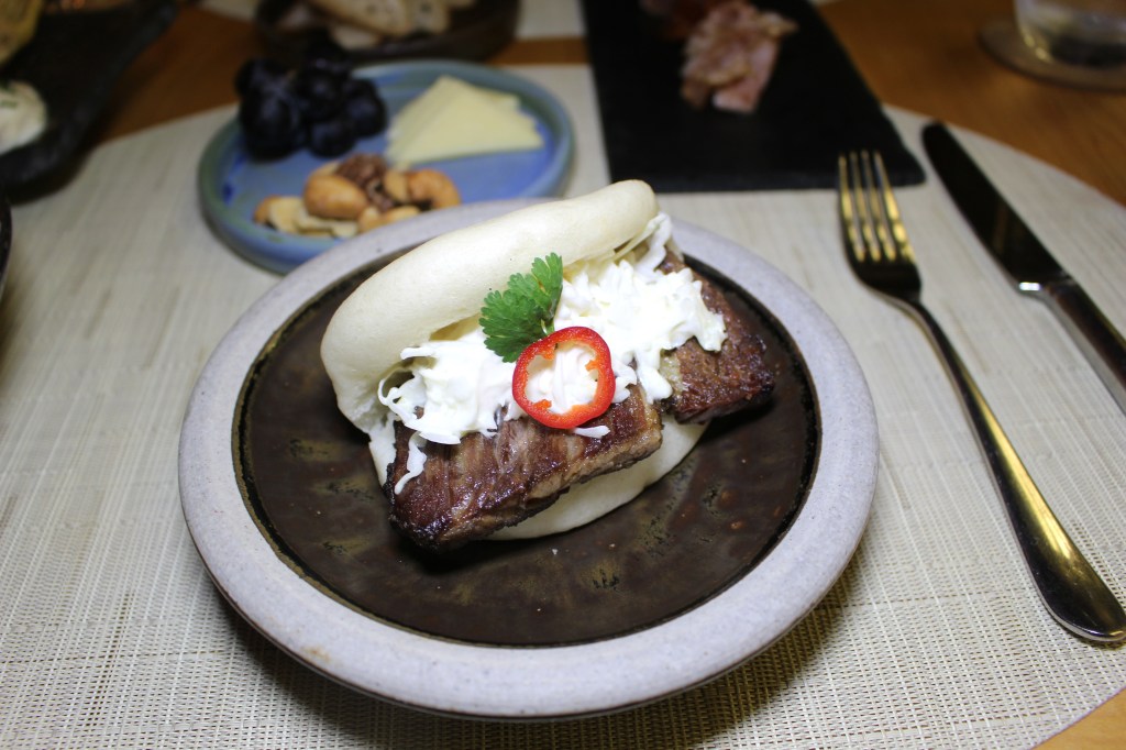 まずは12時間いぶした牛の胸肉を中華まんの皮で包んだお料理です。写真では見にくいのですが、スパイシーなトマトジャムがアクセントになり、キャベツのコールスローと一緒にいただきます。中華まんの皮をこういう使い方ができるのは、お祖母さんの影響でしょうね。