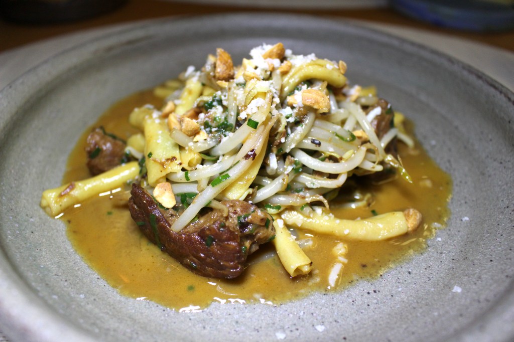 メインはブラックビーンとガーリックを効かせた豚のスペアリブです。スペアリブの上には、エミリア・ロマーニャ州の郷土料理の手打ちパスタ「ストロッツァプレーティ」とモヤシとピーナッツがのっています。アメリカのスペアリブ料理、イタリアの手打ちパスタ、中華でよく使われる食材のモヤシを使った多国籍なお料理に仕上がっています。