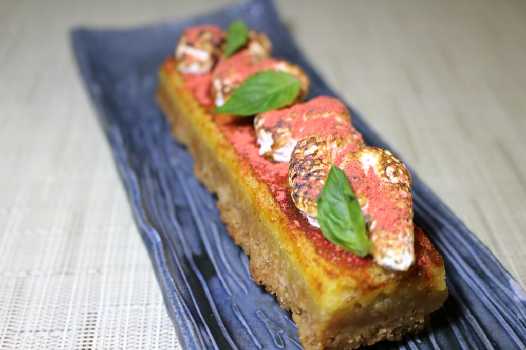 デザートは、こちらもシグネチャーのトーストしたマシュマロのリリコイタルトにしました。上に乗っているピンク色の粉は、ハワイの魔法の粉「リヒムイ・パウダー」です。この甘酸っぱさがたまりません!マシュマロを焼いているので、ちょっとねっとりとした食感がいい感じです。