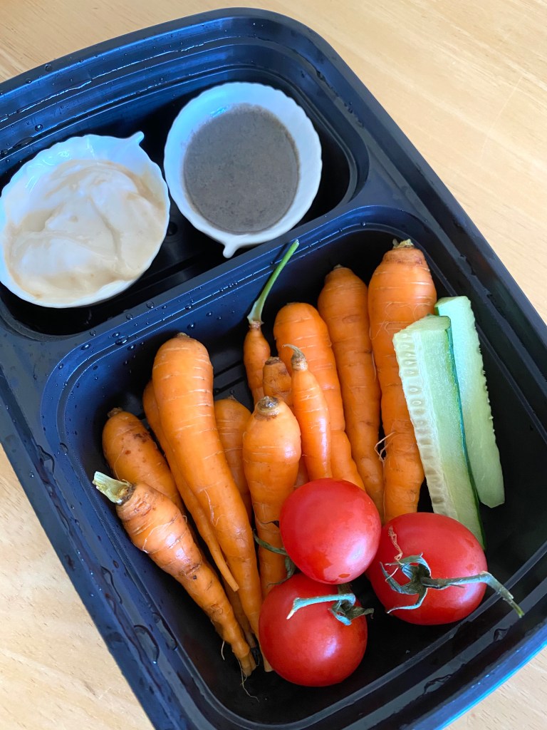 野菜を切ったり、ディップを作るのが面倒だったりしますが、野菜本来の味や食感を楽しめる野菜のスナック弁当を毎朝作っています。野菜は全てファーマーズマーケットで買ったものです。ハワイ島のカムエラ・トマトはカワマタ農園から、きゅうりはハワイカイのマ農園からです。
