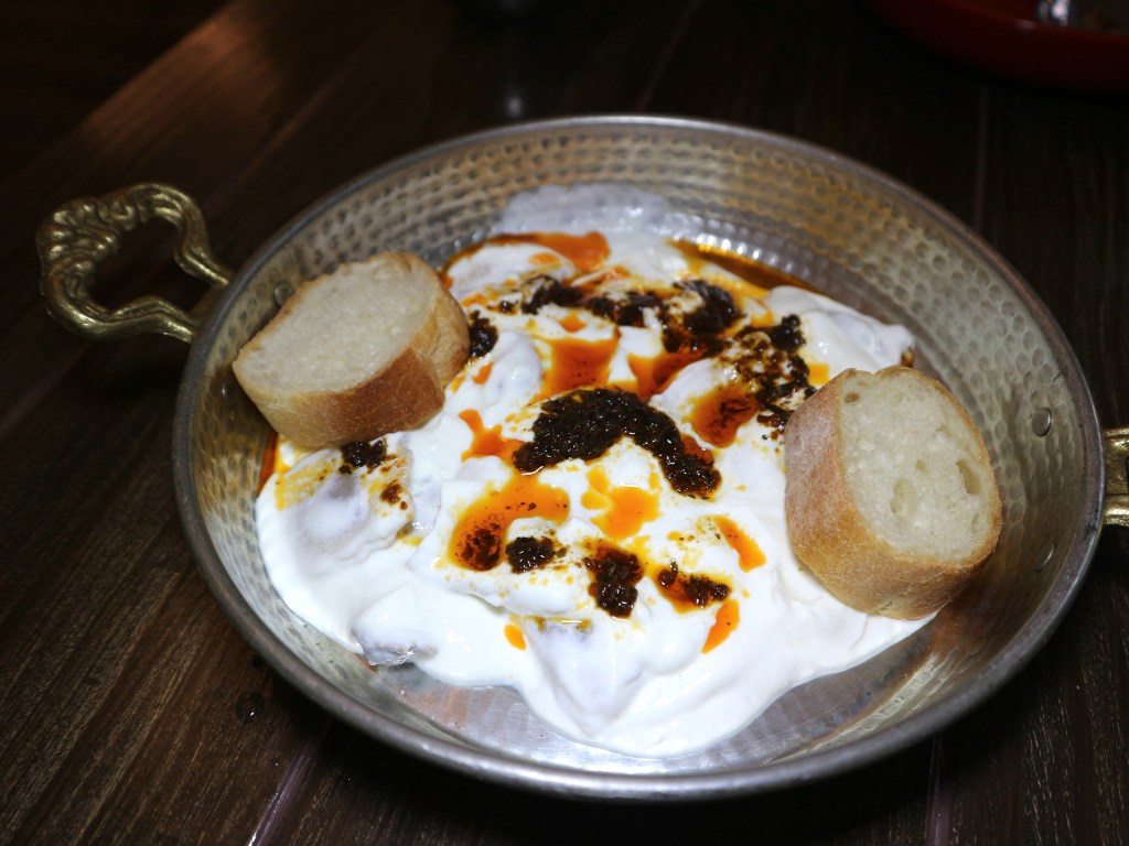 が、実際に出てきたのは全く違っていて、ちょっとびっくり。一口サイズのラビオリのようなマンティの上にはヨーグルトがかけられ、その上にはオレンジ色の焦がしたマラスペッパーが。びっくりしたのは見かけだけではなく、一口食べてまたびっくり。今まで食べたことのない味ですが、ビーフの風味とヨーグルトがよく合い、そこにほとんど辛味を感じないマラスペッパーがアクセントになっています。おっかなびっくりで食べ始めた私たちですが、最後はパンでソースをいただき、しっかり完食しました。