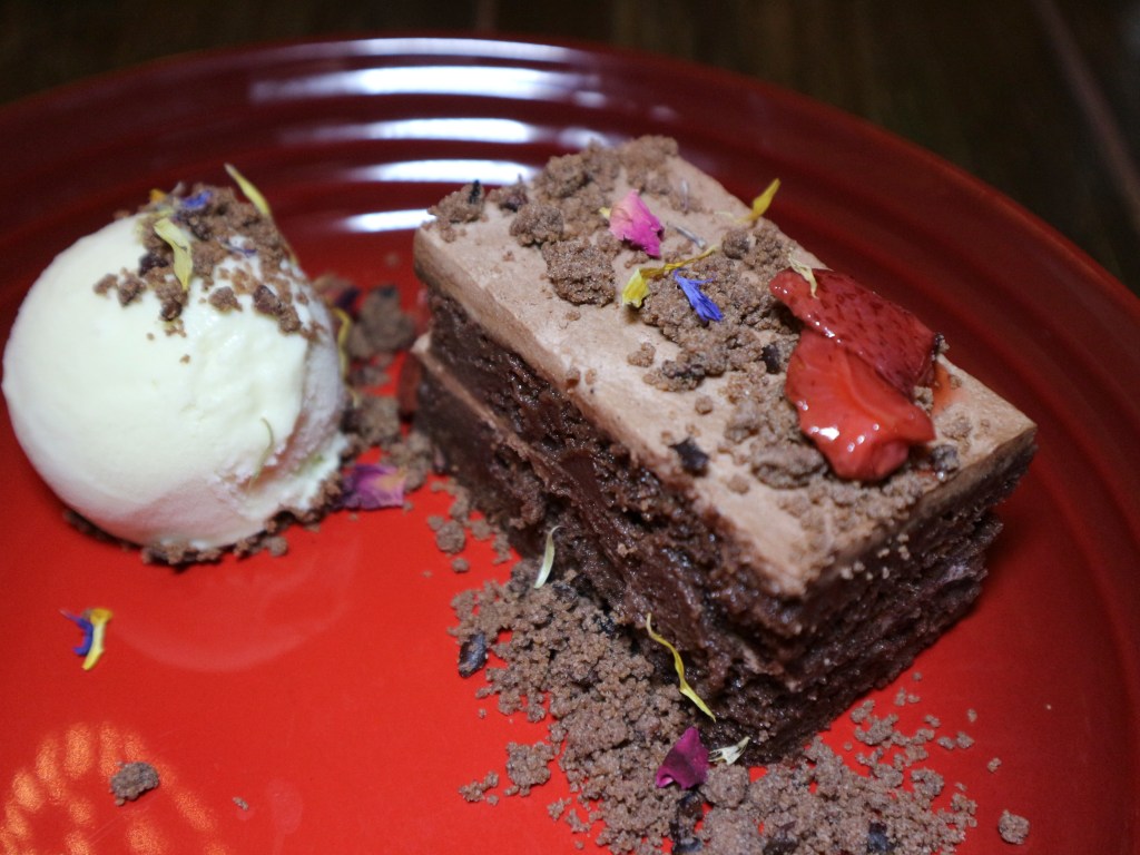 4人前はあるかと思われる前菜を2人で食べたので、結構お腹いっぱいだったのですが、デザートは外せません。バカラヴァが美味しいとは聞いていたのですが、せっかくなので何か違うものを食べようということになり、シェフ・マム・ニリズ・ストル・ケーキにしました。シェフのお母さんのレシピのミルクケーキのようです。フランスのヴァローナのダークチョコレートを使ったケーキにはハワイ産のカカオニブ、そして蜂蜜のアイスクリームが添えられています。見かけほど甘くなく、こちらも完食。というか、私が結構食べちゃいました。