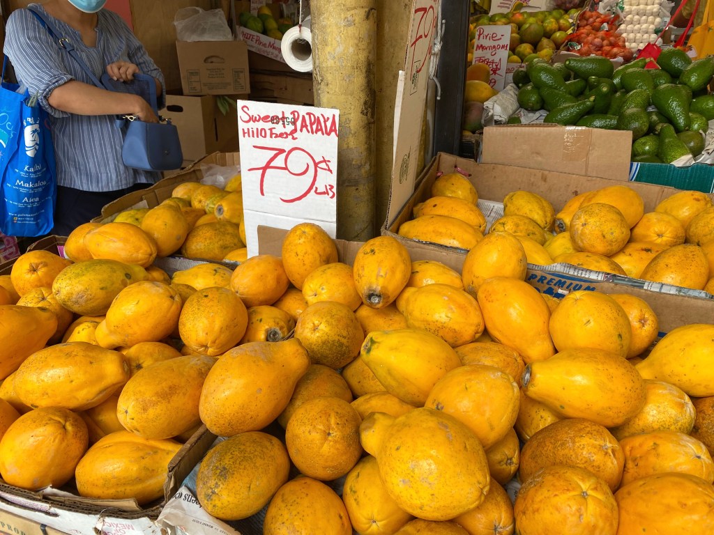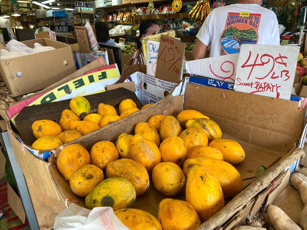 まずは、パパイヤを選びます。ハワイ島ヒロ産のパパイヤが1パウンド(約450グラム)79セント?! ファーマーズマーケットやスーパーでは安い時で99セントなので格安です。