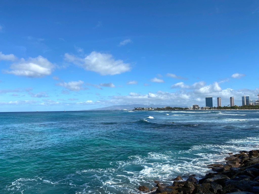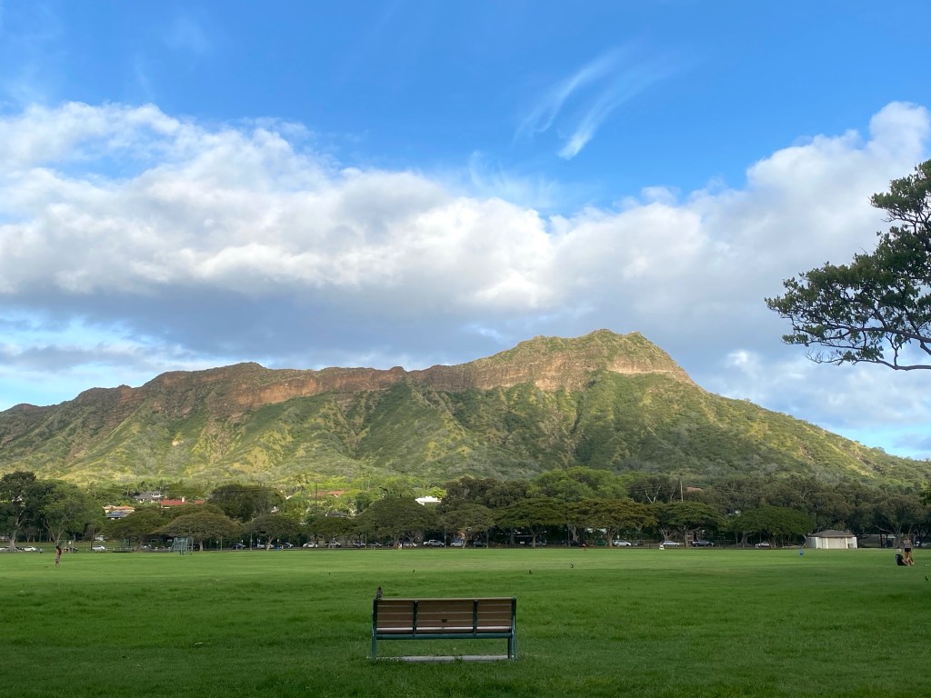 今日は私が一番お気に入りの住宅街の中の急な坂道を散歩することにしました。かなり上まで登ったところで、道の反対側に目をやると、何と孔雀がいたんです。最近はホノルルの住宅街でもニワトリをよく見かけるようになりましたが、孔雀との遭遇は初めてです。