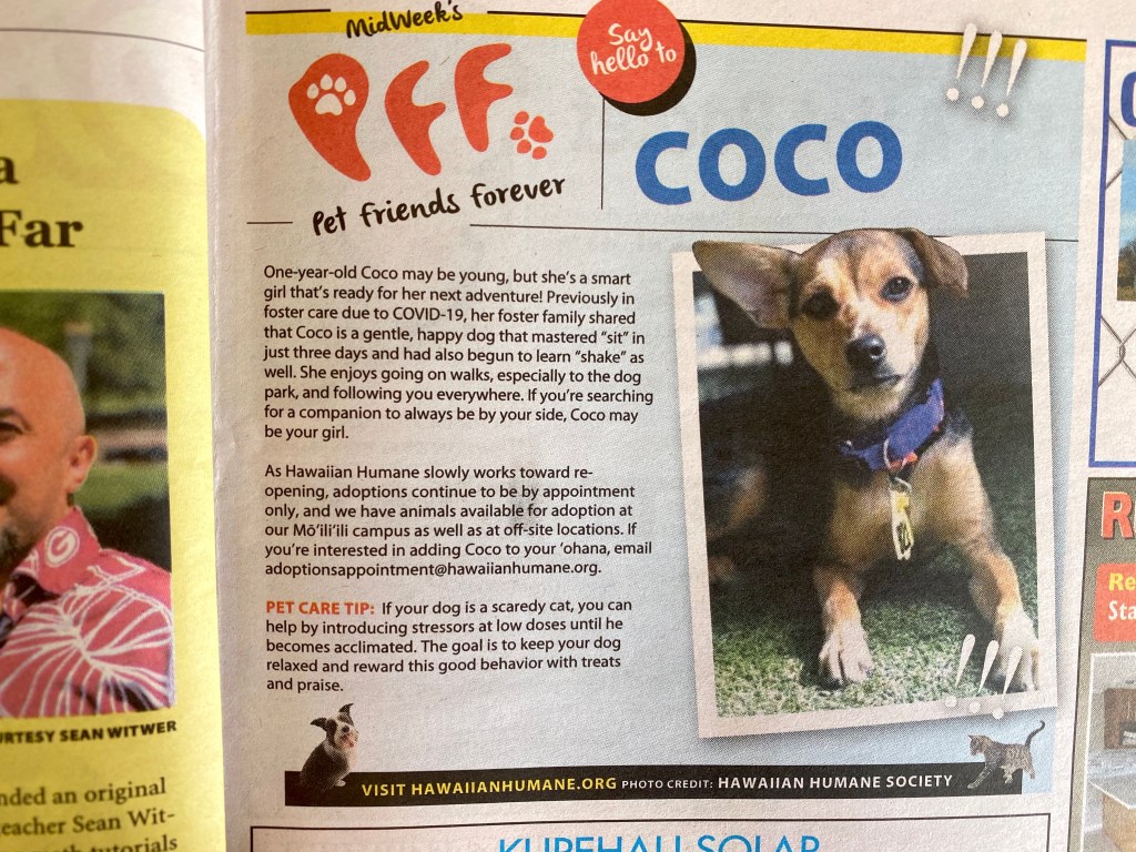 MidWeekでは、毎号、Hawaiian Humane Societyが引き取り手を探している動物(大抵の場合、犬か猫)の写真と紹介文を掲載しています。